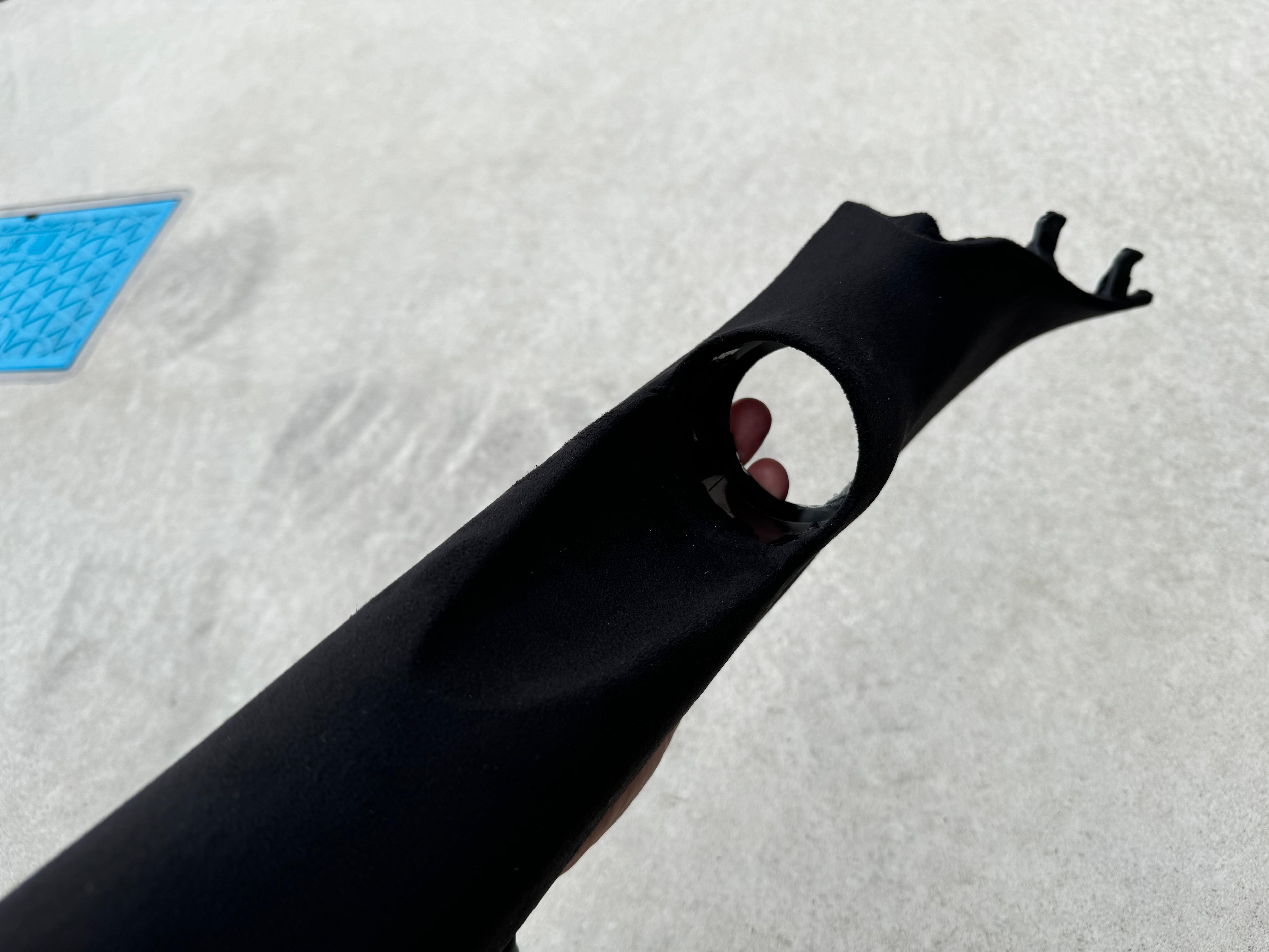 FRPで形を作ったあとにパテで造形し、表面を仕上げた後にブラックのスエード生地を1枚貼りで貼り付けます。